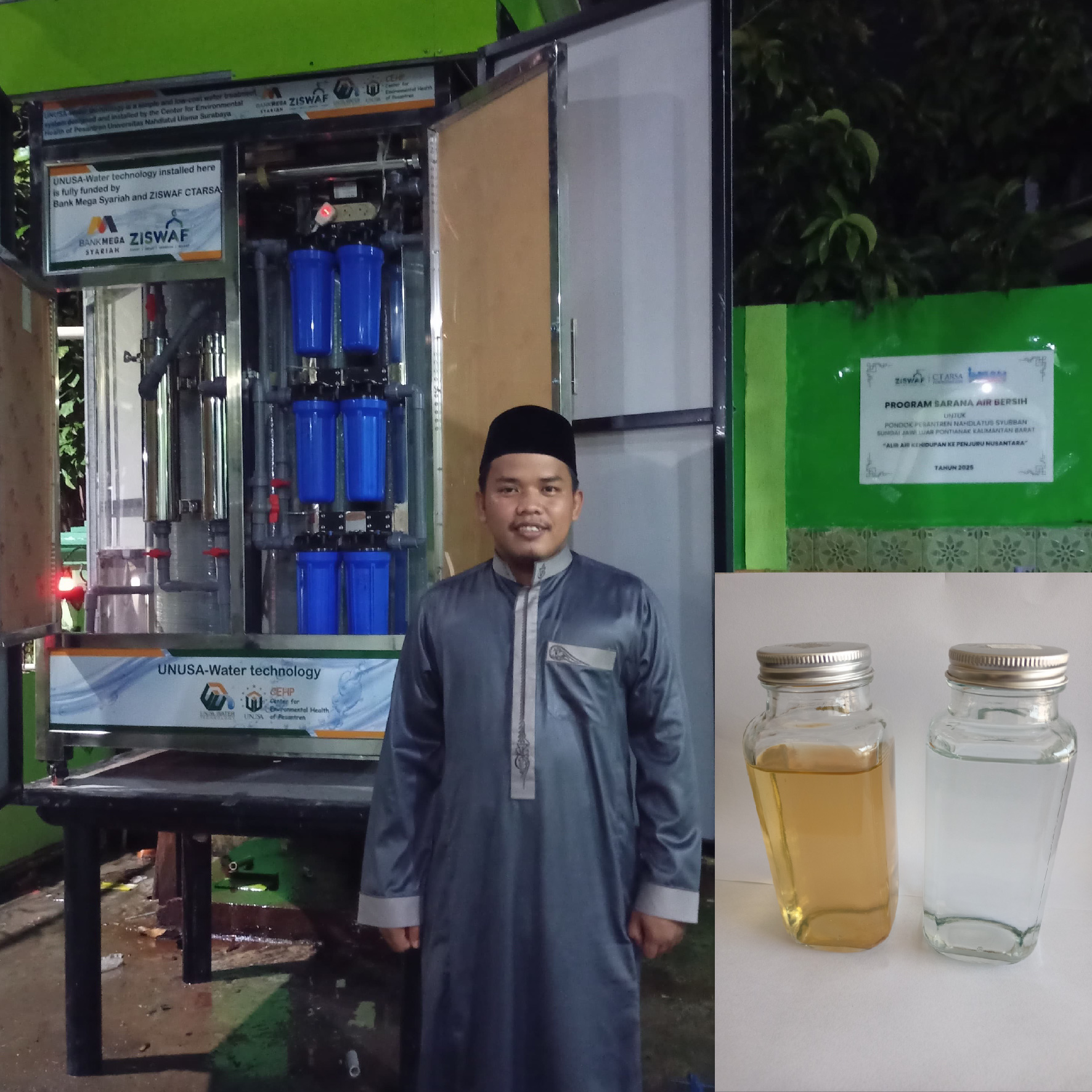 UNUSA-Water as Water Filters Arrive at Pesantren Darul Faizin in Kubu Raya, Transforming Yellow, Iron-Containing Water into Clear Water with Support from CTARSA ZISWAF and Bank Mega Syariah